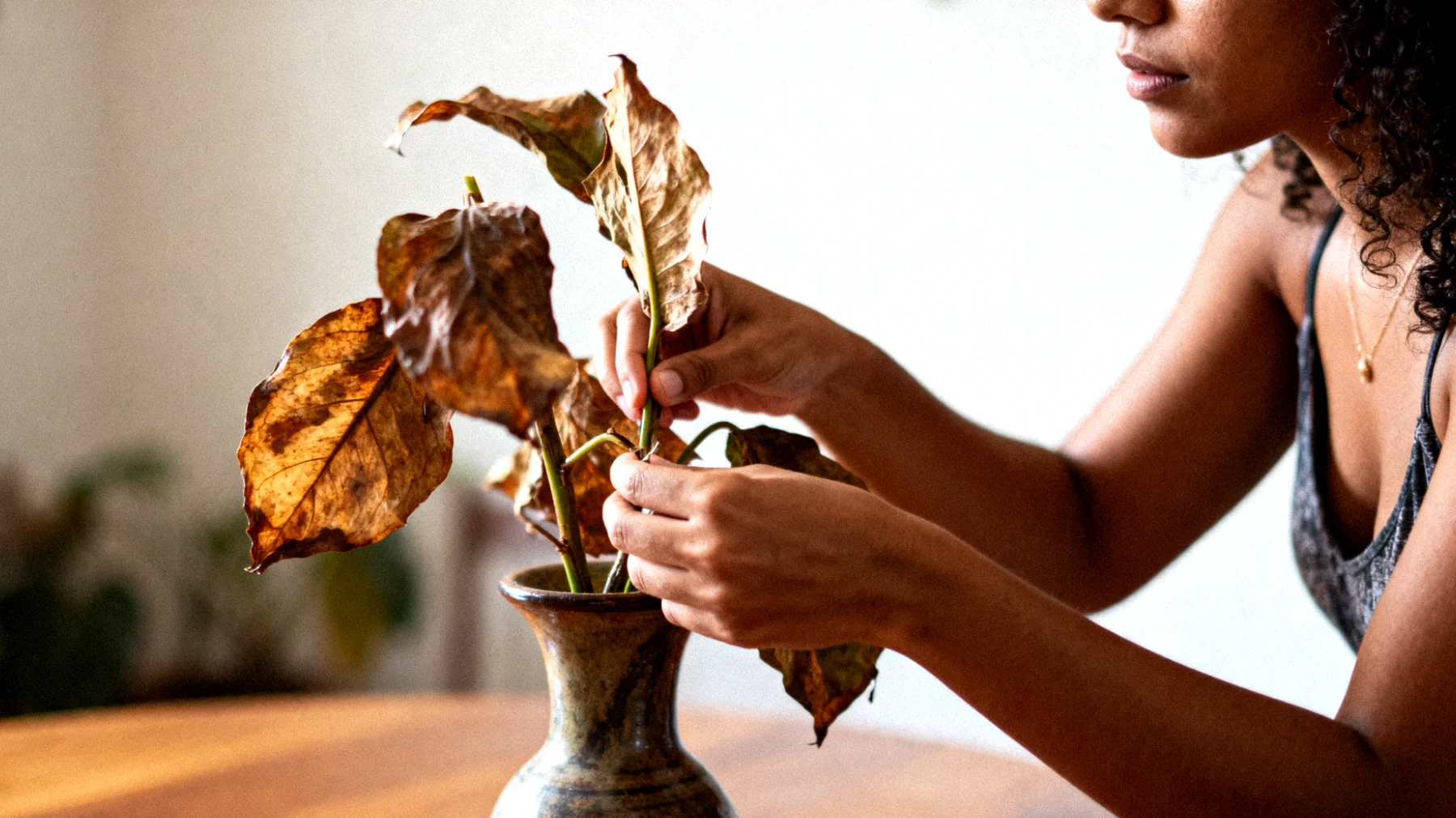 Die Idee, ein verwelktes Blatt in den Mittelpunkt eines Tisches zu stellen – nicht als Zeichen von Vernachlässigung, sondern als bewusste gestalterische Entscheidung –, mag zunächst kontraintuitiv erscheinen. Unsere Kultur verbindet Frische oft mit lebendigen, grünen Pflanzen, während Welkes als unattraktiv gilt. Doch gerade in dieser Umwertung liegt eine besondere Qualität: Die Anerkennung, dass Schönheit auch in Übergangsstadien existiert, dass Alterung ein natürlicher Prozess ist, der nicht versteckt werden muss.